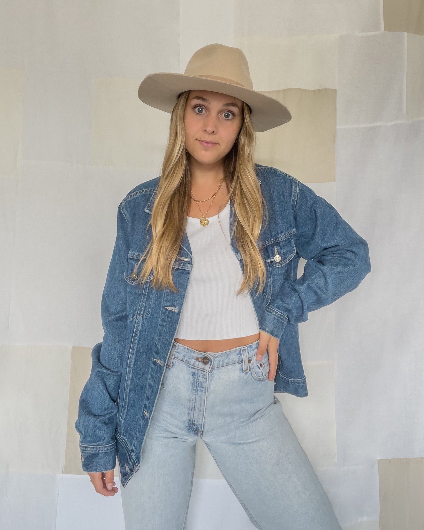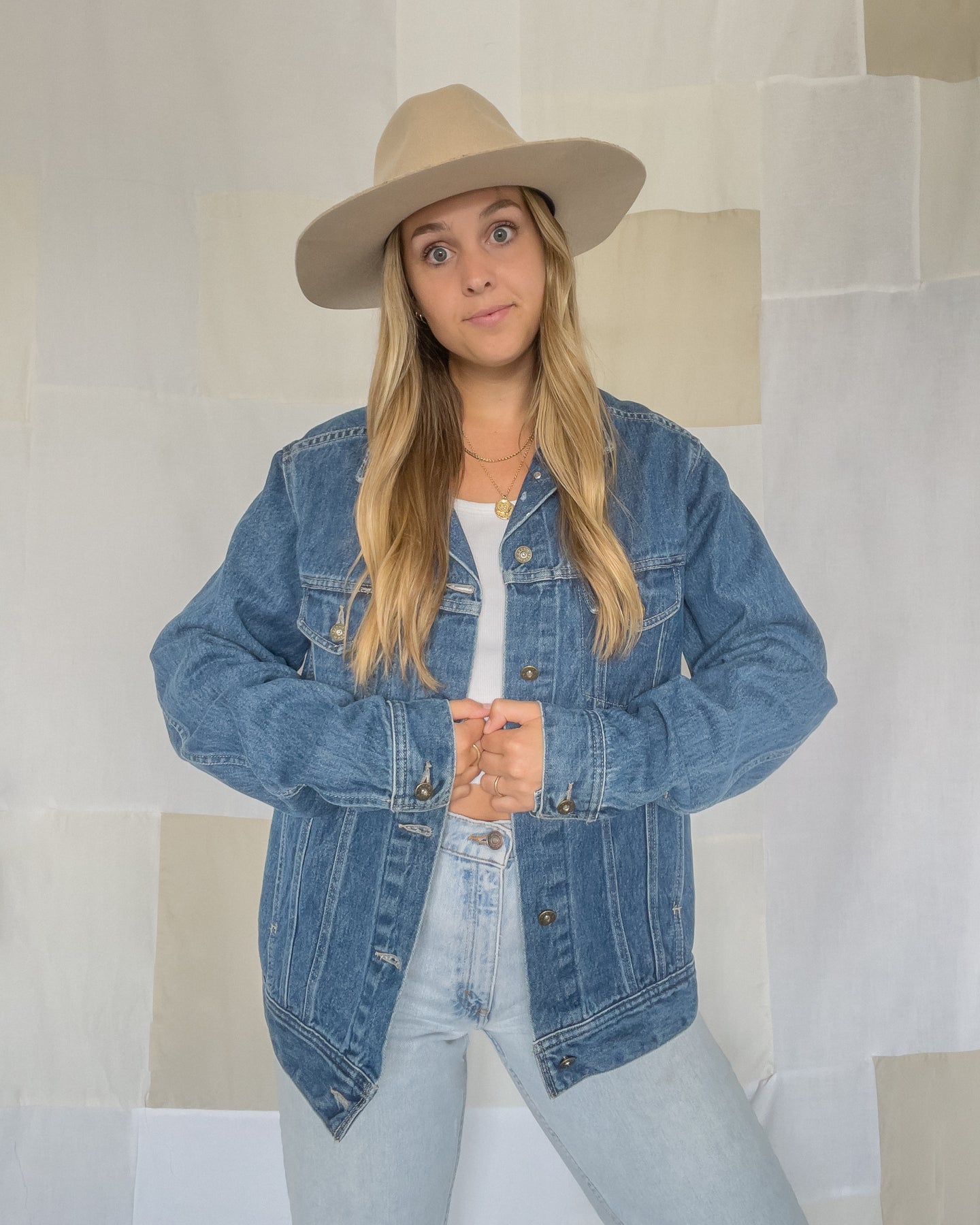 Vintage 90's Denver Hayes denim jacket with metal buttons, four pockets and white stitching. 100% cotton.
