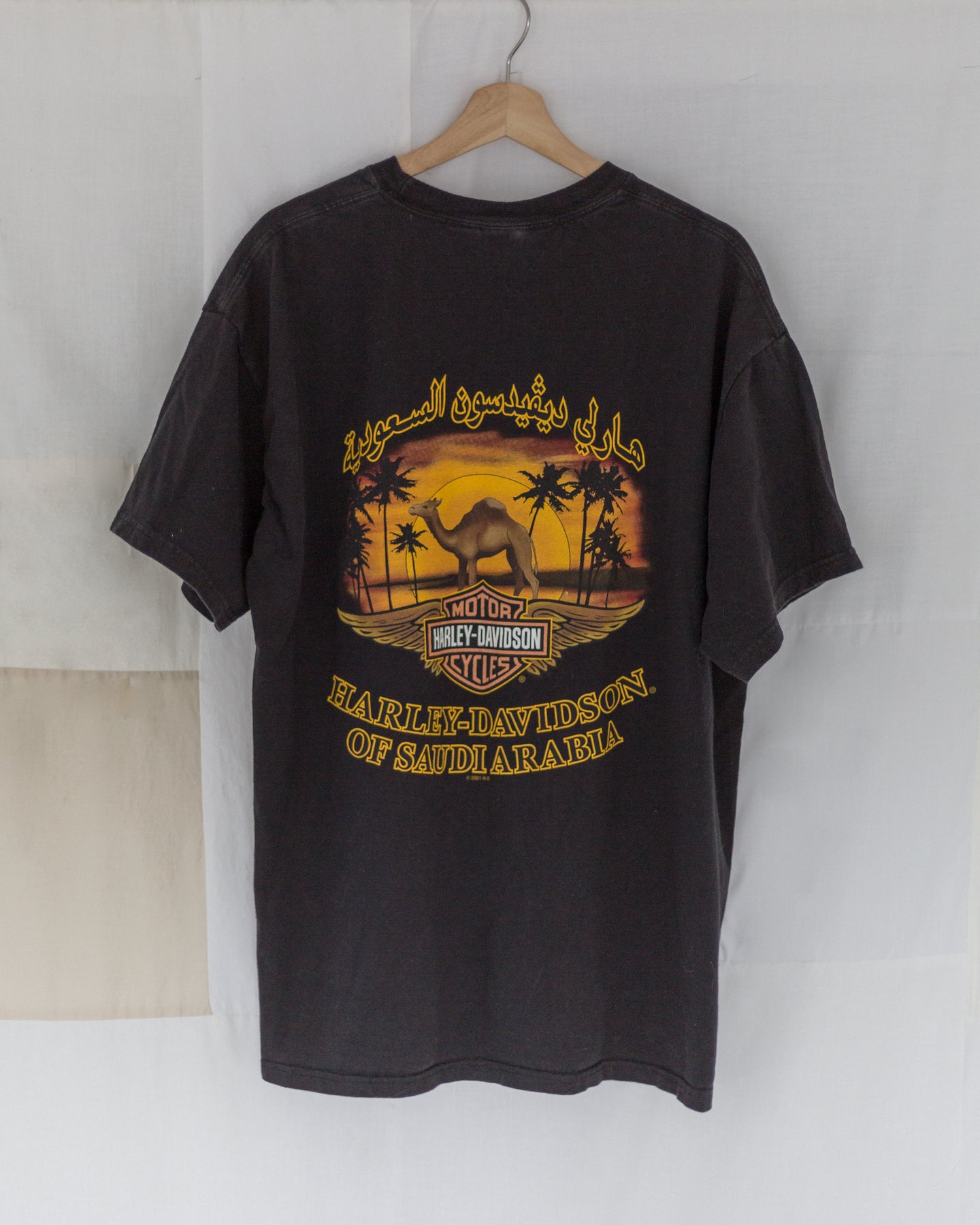 2001 Harley Davidson Saudi Arabia t-shirt. In good vintage condition, a few small holes around the neckline.