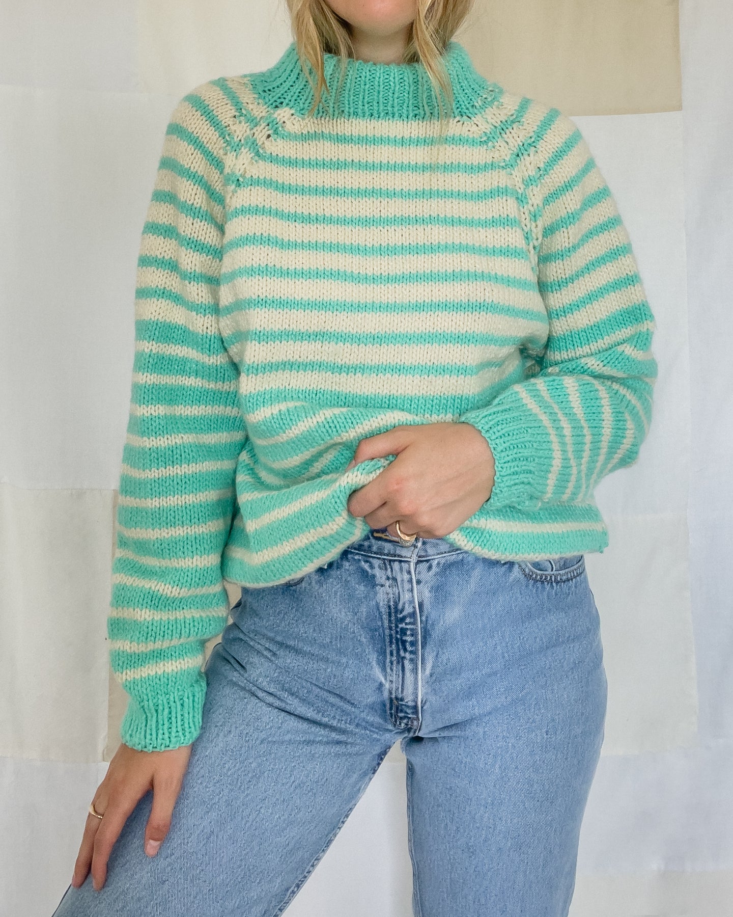 Vintage pastel green striped turtleneck knit sweater made from soft woven cotton.