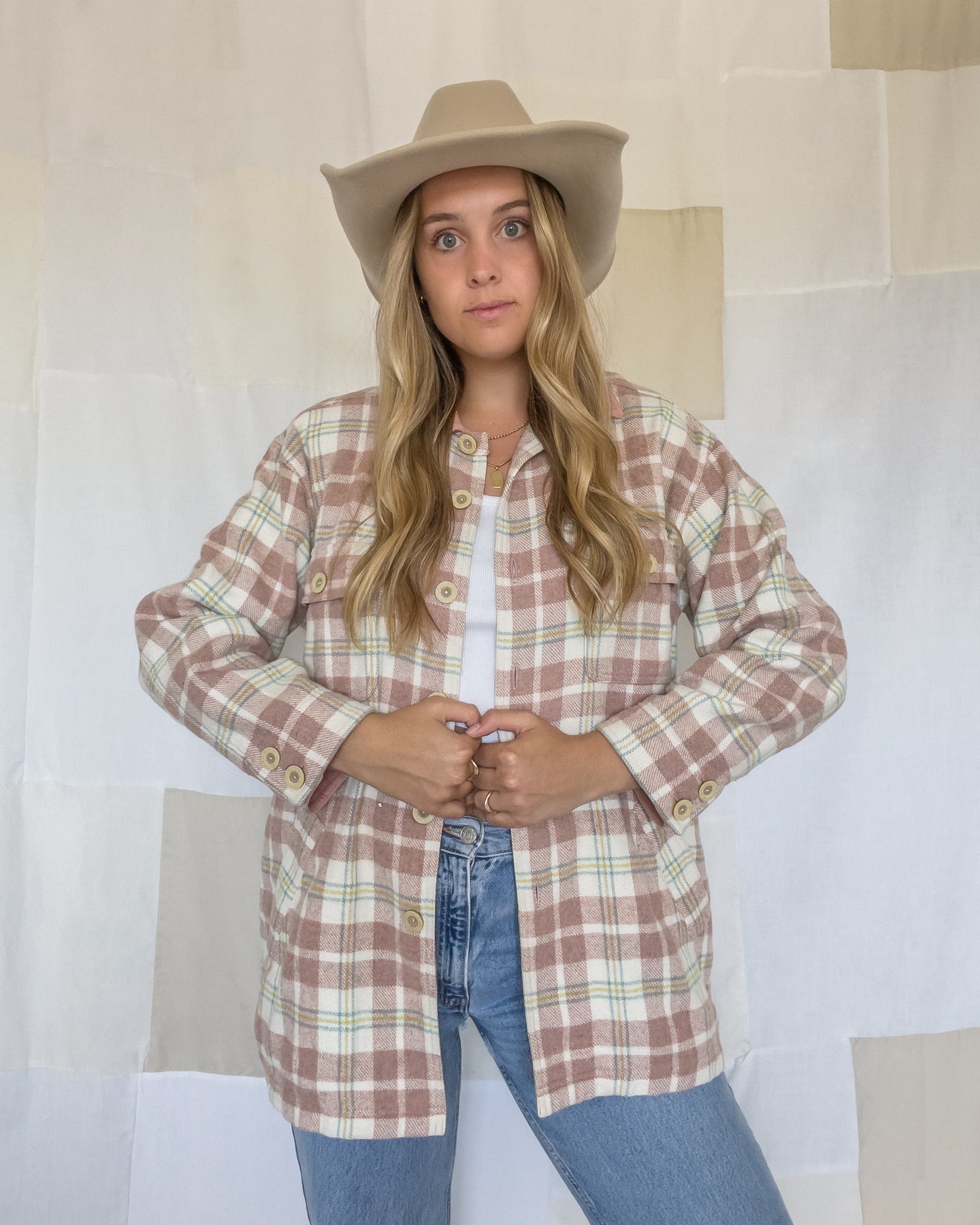 Vintage cream and pink plaid shacket. This shirt jacket features a corduroy collar, textured buttons, and is fully lined. Made from 55% cotton, 35% polyester and 10% other materials.