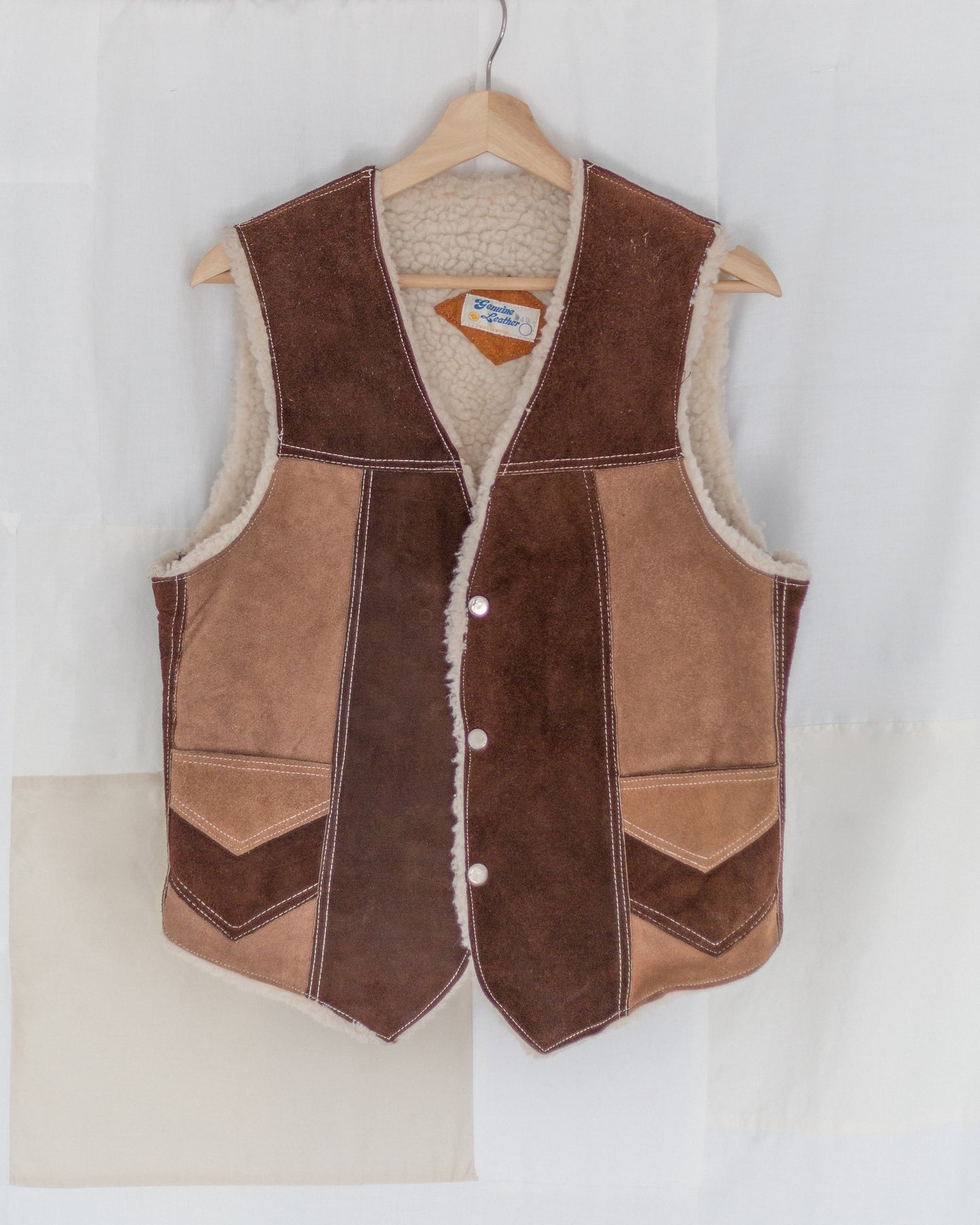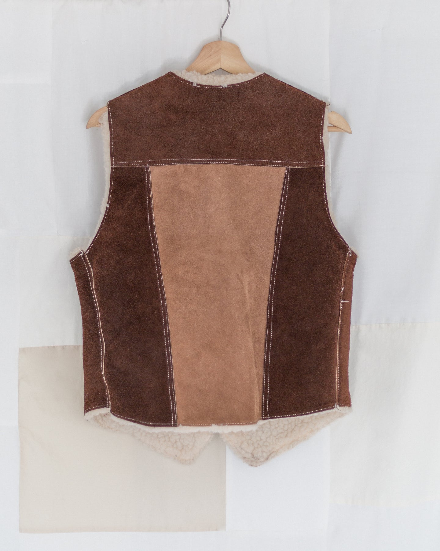 Vintage Western suede sherpa vest. Features snap buttons and two pockets.
