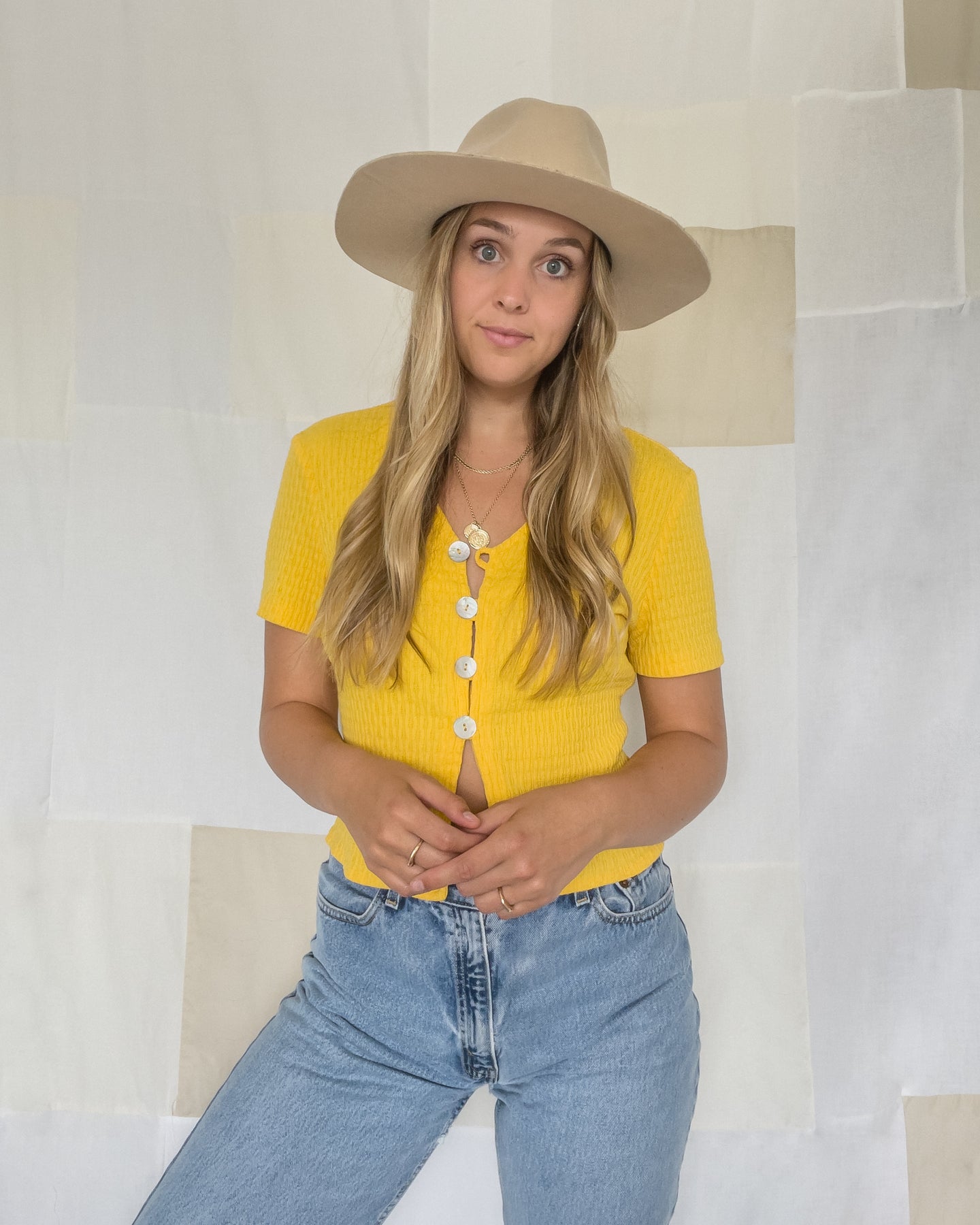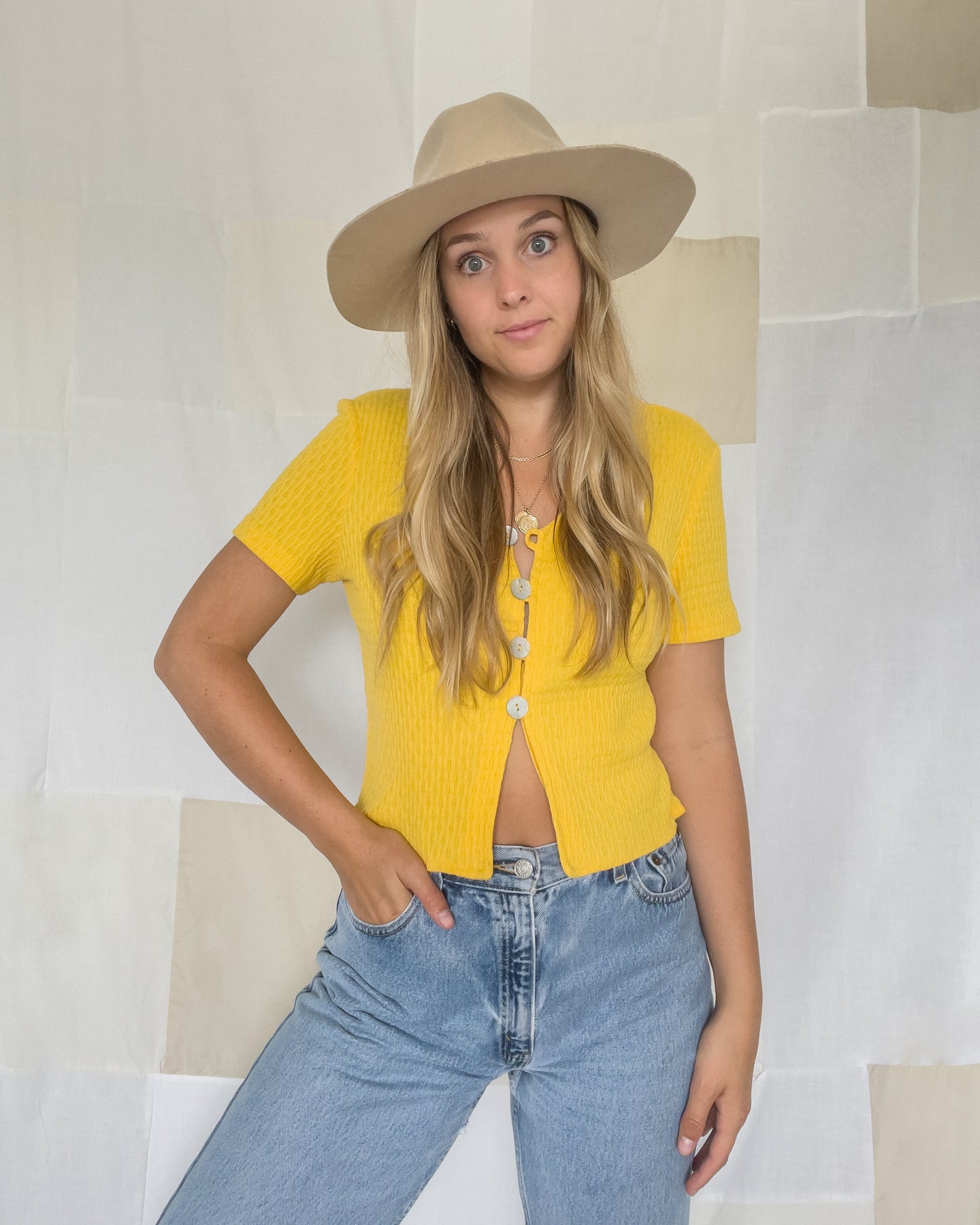 Vintage sunshine yellow cropped t-shirt. Features four beautiful shell buttons.